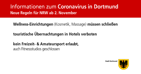 Ab Montag, 2. November 2020, gilt die neue Corona-Schutzverordnung des Landes NRW incl. Hygiene- und Infektionsschutzanforderungen. Die neue Verordnung gilt bis zum 30. November 2020 (ausführlich siehe Anlage)