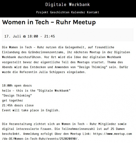 Die Women in Tech (WIT) Ruhr als Gast des Gründerinnenzentrums in der digitalen Werkbank. Interessierte Frauen sind herzlich willkommen. Es gibt 25 Plätze, die über das Anmeldetool des das meetup Event der WIT-Ruhr angemeldet werden können. WIT-Ruhr schreiben: