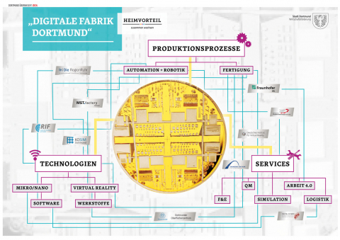 Um in Gesprächen mit produktionsrelevanten Akteuren den Blick der Investoren auf das Wesentliche zu lenken und den Kollegen eine Argumentationshilfe zu bieten, haben die Teams Wissenskerne und Standortkommunikation das Themenposter "Digitale Fabrik Dortmund" entwickelt, welches nun digital im Anhang und im Printformat vorliegt. Dieses stellt auf einen Blick die Struktur des Produktionsstandortes Dortmund mit seinen Themen-, Technologie- und Branchschwerpunkten dar.