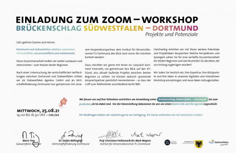 Dortmund und Südwestfalen arbeiten zusammen: wirtschaftlich, wissenschaftlich und institutionell. Diese Zusammenarbeit möchten wir weiter ausbauen. Gemeinsam mit der Südwestfalen-Agentur laden wir deshalb zu einem interaktiven Zoom-Workshop ein, um Projektideen und Potentiale zu besprechen. Wenn Sie sich gerne mit Ihren Einblicken und Ideen aus institutioneller oder unternehmerischer Sicht einbringen möchten - Seien Sie herzlich willkommen!