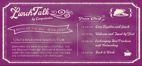 Das Kompetenzzentrum Frau & Beruf Westfälisches Ruhrgebiet lädt zum Online-LunchTalk am 16. März 2021 zur neuen Unternehmenskultur bei SCHAMP & SCHMALÖER ein.